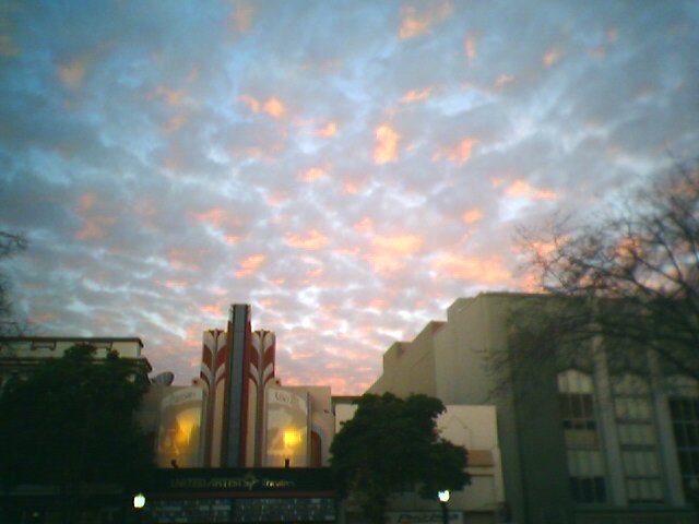 Sunrise over Shattuck Ave. in Berkeley this morning, setting the clouds aglow. I wish I'd had a real camera; my cameraphone didn't come close to doing this justice!